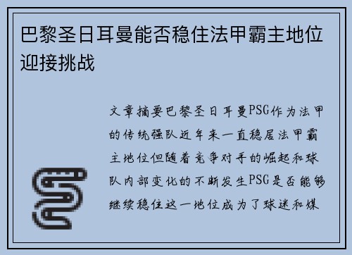 文章摘要:巴黎圣日耳曼(PSG)作为法甲的传统强队,近年来一直稳居法甲霸主地位,但随着竞争对手的崛起和球队内部变化的不断发生,PSG是否能够继续稳住这一地位,成为了球迷和媒体热议的话题。本文将从球队的阵容深度、财务状况、竞争对手的崛起、以及管理层和教练组的变化等多个方面进行分析,探讨巴黎圣日耳曼在未来能否继续称霸法甲,并迎接来自国内外的挑战。
