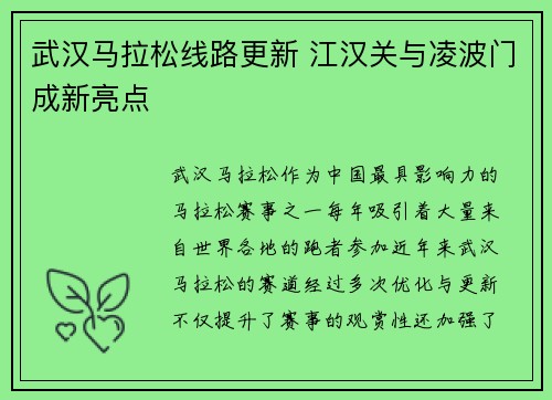 武汉马拉松作为中国最具影响力的马拉松赛事之一,每年吸引着大量来自世界各地的跑者参加。近年来,武汉马拉松的赛道经过多次优化与更新,不仅提升了赛事的观赏性,还加强了赛道的历史文化氛围。特别是2025年武汉马拉松赛道的重大更新,引入了江汉关与凌波门这两个新的亮点,使赛事更加丰富多彩。江汉关作为武汉历史的象征之一,而凌波门则是城市新兴地标的重要代表,这两个新加入的地标,不仅让参赛者能更好地感受到武汉独特的城市魅力,也让赛事的观众体验更加丰富。本文将从赛道更新的背景、江汉关与凌波门的历史文化意义、赛道新变化的赛事影响、以及未来发展等方面,对武汉马拉松的线路更新进行详细分析。