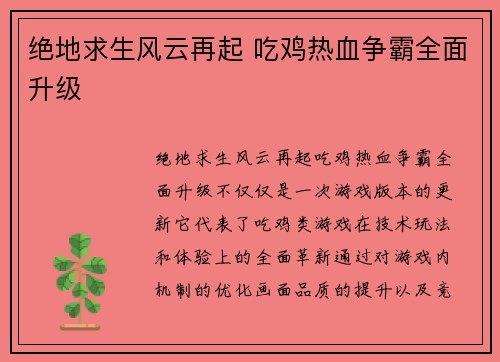 《绝地求生风云再起 吃鸡热血争霸全面升级》无疑是一次具有里程碑意义的更新。这次更新不仅仅在游戏玩法、画面表现和社交系统上做出了大幅度的改进,还在赛事系统的升级上为游戏开辟了新的发展方向。对于玩家来说,这次更新无疑是一次全新的游戏体验,带来了更多的挑战与机遇。